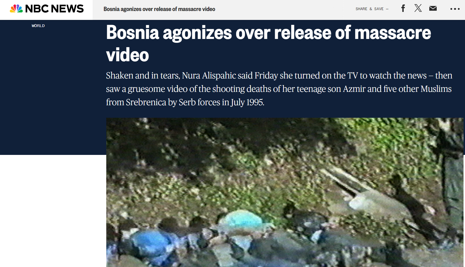 "I turned on the TV at 10 o'clock, just like that, I didn't know it would be on. And I hear them say: Unfortunately, now a mother will recognize her son, a sister her brother... When they started, they showed four of them killed, and left two to remove the dead - and then I see, one is my Hasko... I was alone in the room. I called my daughter: Come, here's Hasko. By the time she came, I saw their hands were placed like this. They killed the one in front of him. My son turned around and looked as if he was seeking some help, like something. As he turned around and looked, they killed him too. As they killed him, he fell to the ground. I cried out: Ahh, son, they killed you. It was as if they had killed him right then. When I saw that, I lost consciousness, I couldn't come to for two hours. My daughter was with me, later I only then realized what had happened," said mother Nura after she first saw the footage of her son Azmir's murder.
